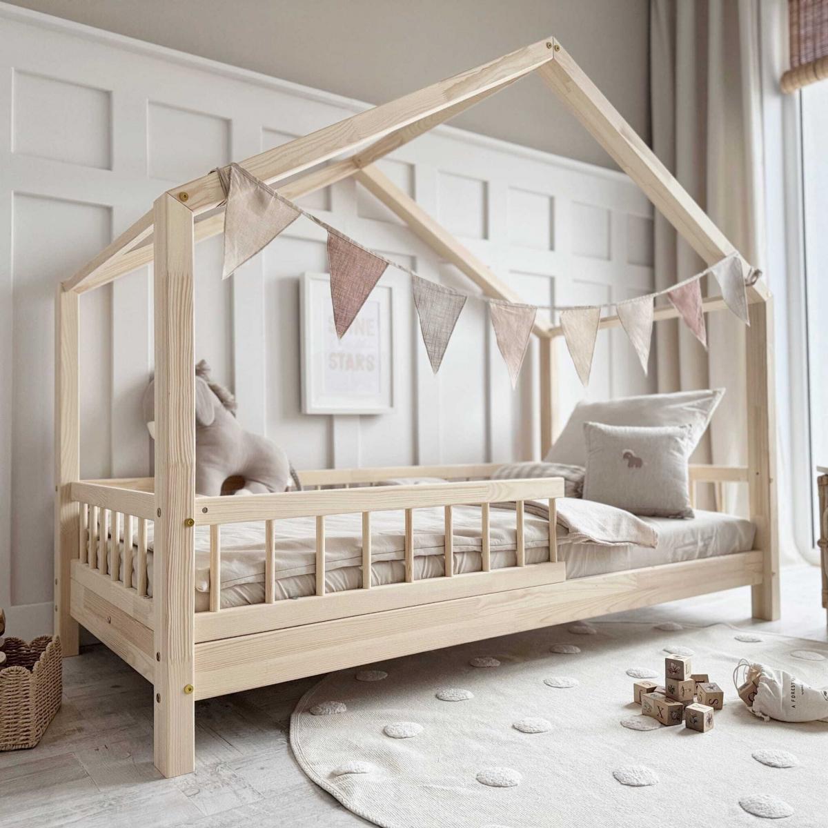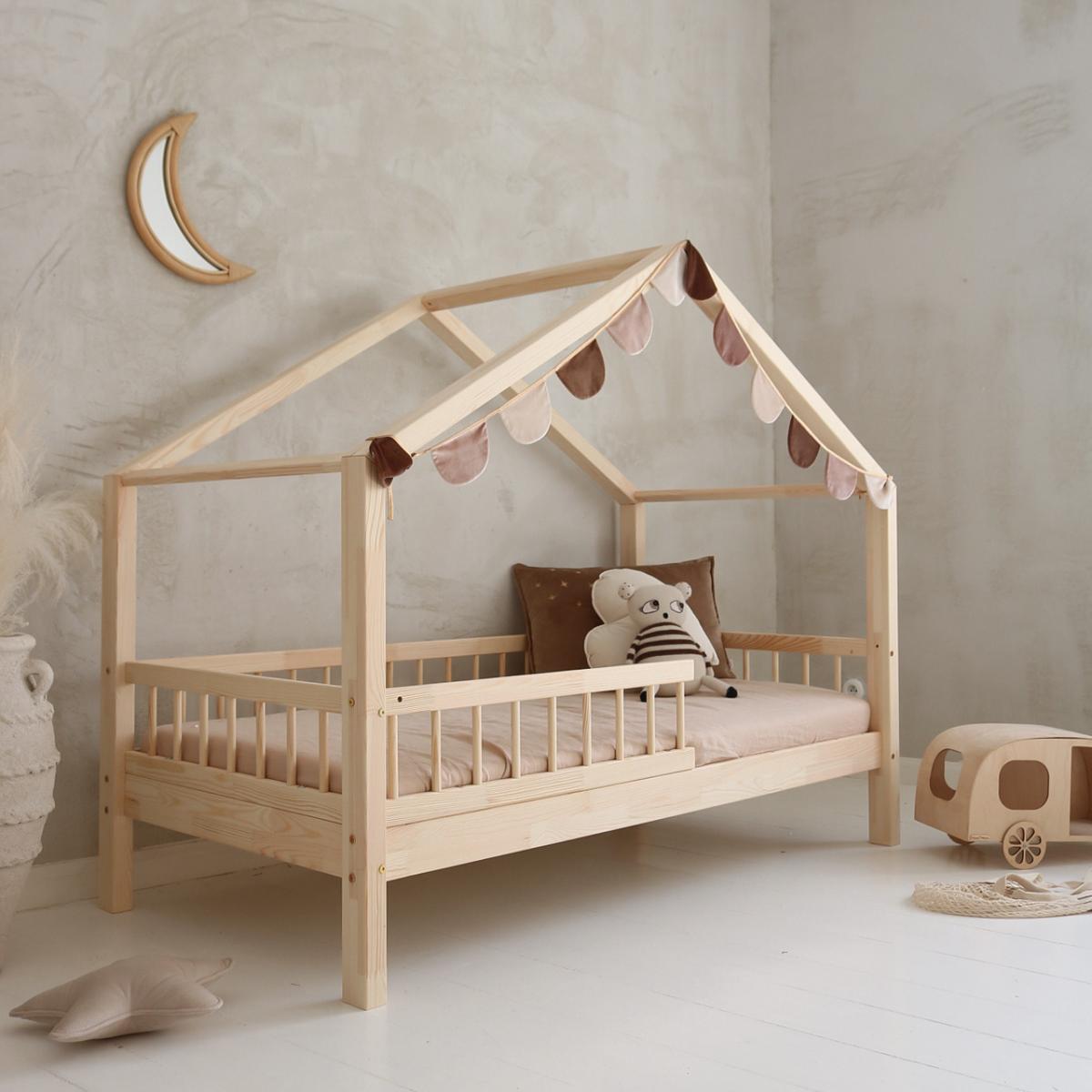 A házikó-forma tető dekorálható fényfüzérekkel, textíliákkal vagy baldachinnal – így az ágy igazi mesés kuckóvá válik.