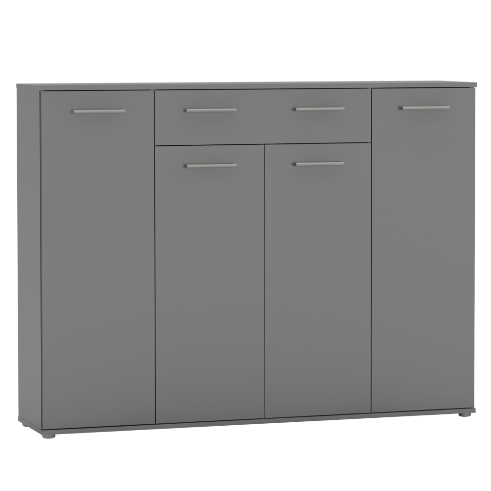 Anyag: laminált DTD Szín: grafit Méretek (SzxMéxMa): 160x35x120,4 cm Anyag vastagsága: 1,6 cm A felső lemez teherbírása: 10 kg Négyajtós Polcos Polcok teherbírása: 5 kg Egy fiók Fiók méretei (SzxMa):78x17,55 cm Teherbírás fiók: 5 kg Fogantyúkkal Fogantyú anyaga: PVC Fogantyú színe: ezüst Csúszkákon Praktikus Többfunkciós Minőségi szlovák termék Javasoljuk a falhoz rögzíteni Szétszerelve szállítva