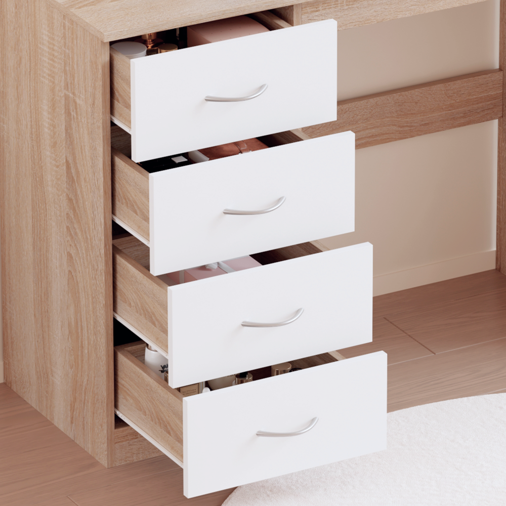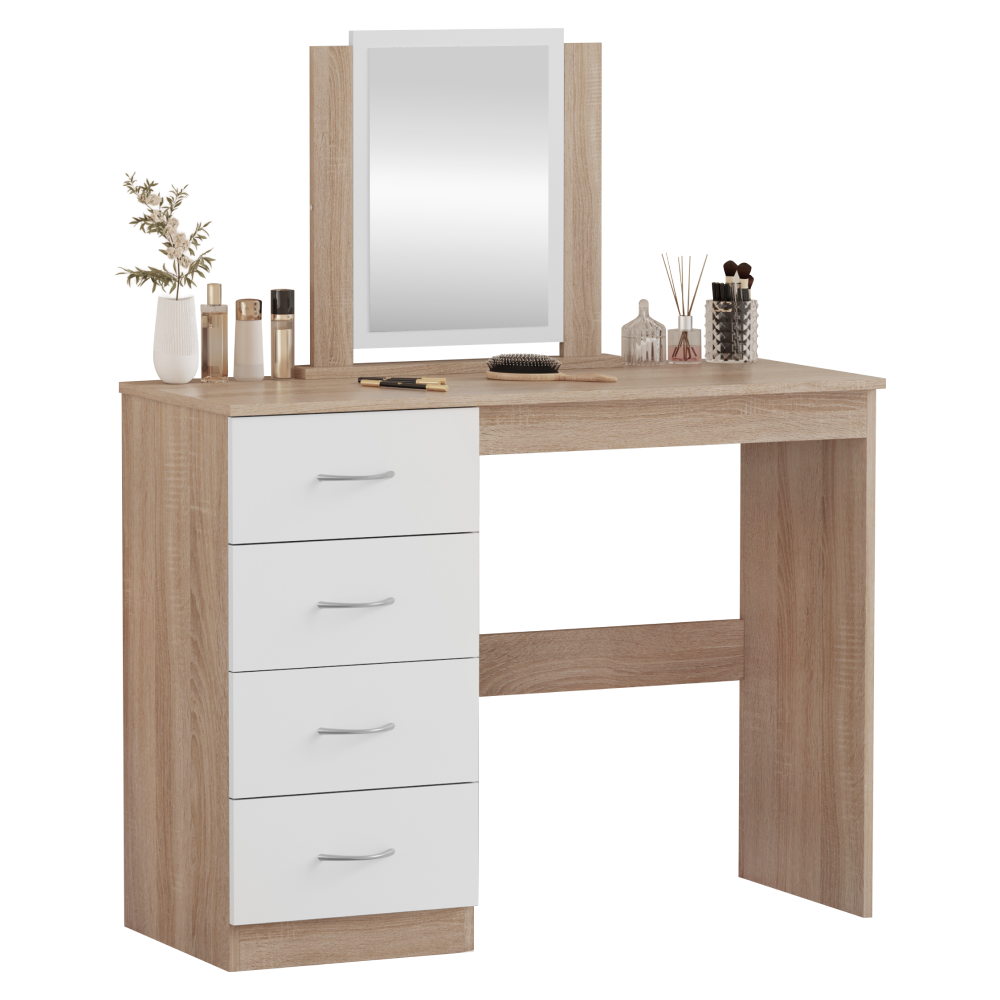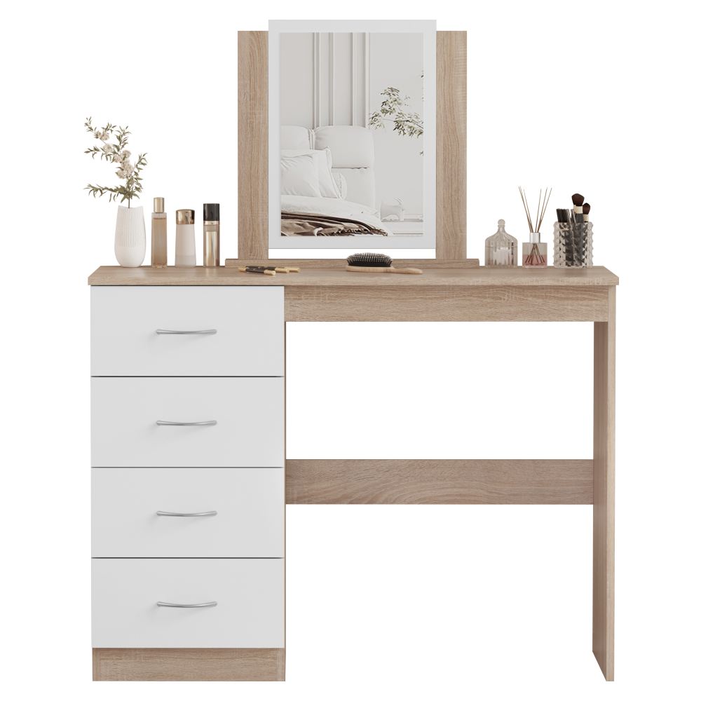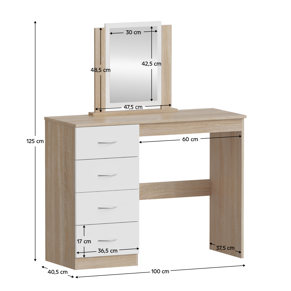 Anyag: laminált MDF Szín: sonoma tölgy/fehér Méretek (SzxMéxMa): 100x40,5x125 cm Anyagvastagság: 1,7 cm Tárhellyel 4 fiók Fiókok méretei (SzxMa): 36,5x17 cm Fiókok teherbírása: 15 kg Felső lap teherbírása: 55 kg Fogantyúkkal Fogantyúk anyaga: műanyag Fogantyúk színe: ezüst Tükörrel Tükör méretei (SzxMa): 30x42,5 cm Modern dizájn Szétszerelve szállítva