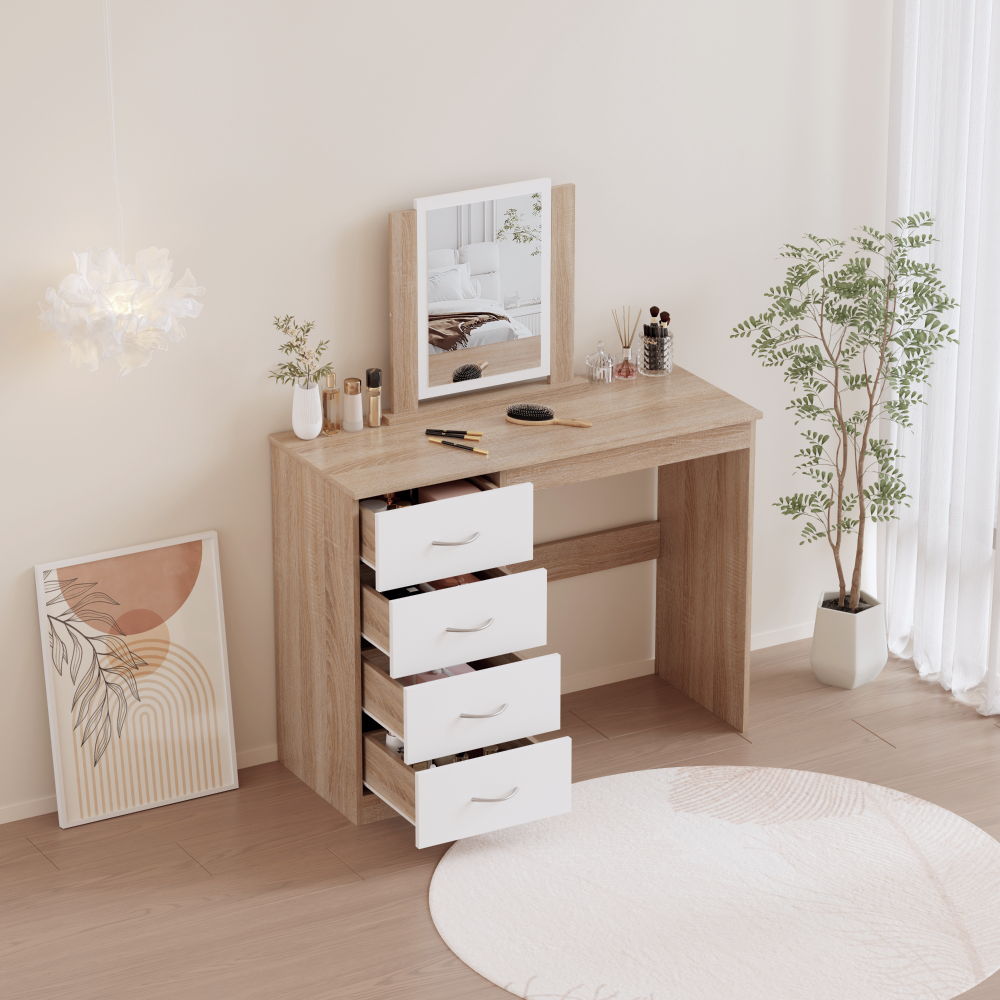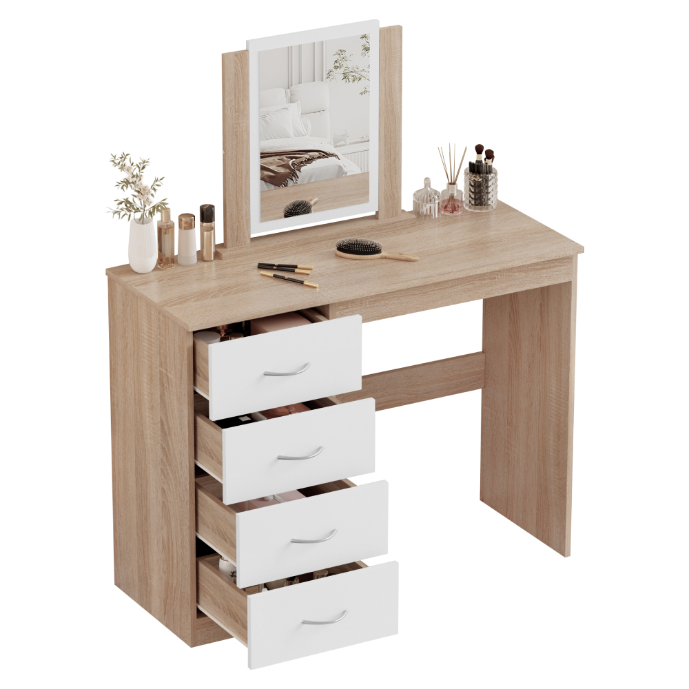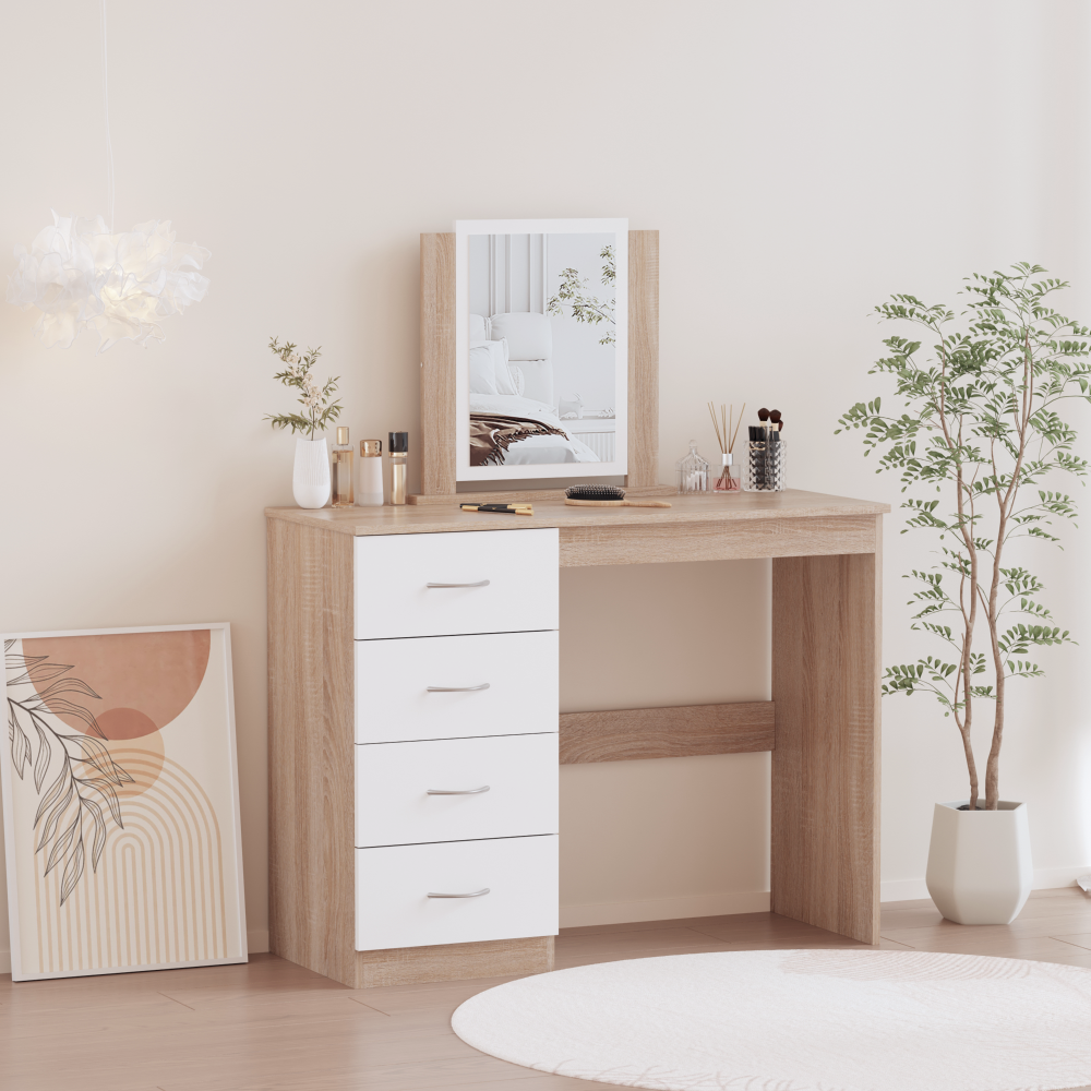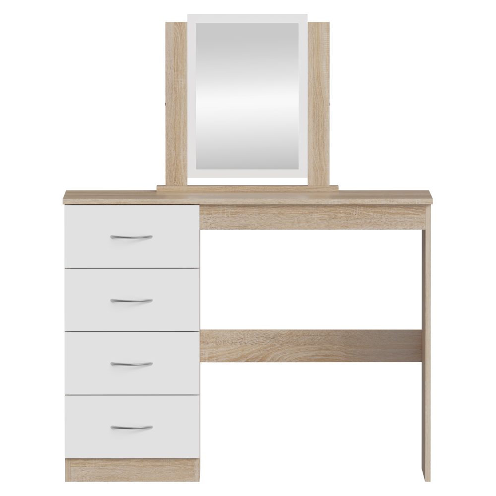 Anyag: laminált MDF Szín: sonoma tölgy/fehér Méretek (SzxMéxMa): 100x40,5x125 cm Anyagvastagság: 1,7 cm Tárhellyel 4 fiók Fiókok méretei (SzxMa): 36,5x17 cm Fiókok teherbírása: 15 kg Felső lap teherbírása: 55 kg Fogantyúkkal Fogantyúk anyaga: műanyag Fogantyúk színe: ezüst Tükörrel Tükör méretei (SzxMa): 30x42,5 cm Modern dizájn Szétszerelve szállítva