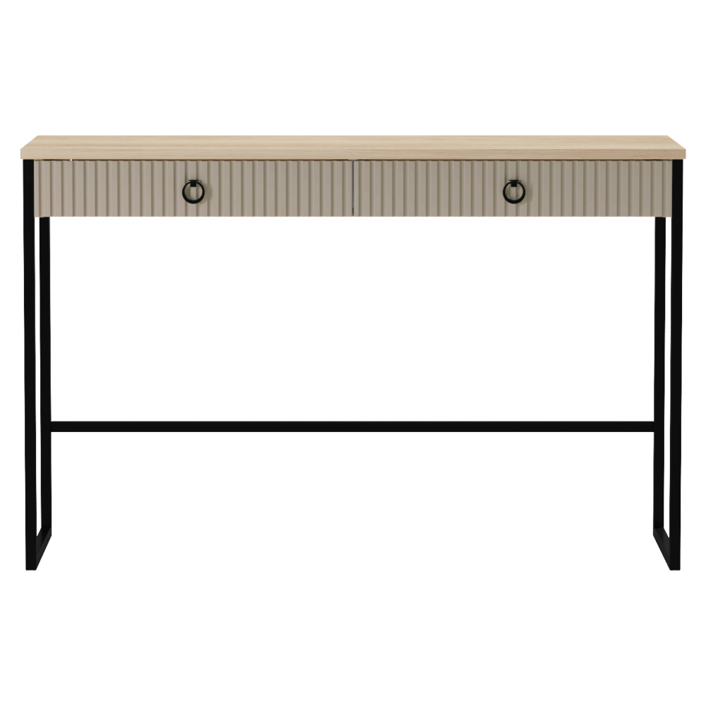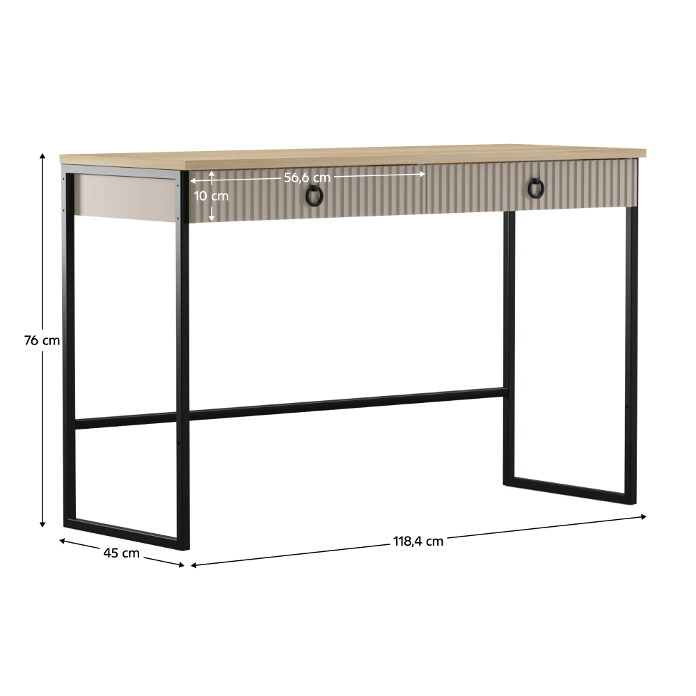 Anyag: laminált DTD/fóliázott MDF Szín: szürkésbarna Taupe/silverjack tölgy Méretek (SzxMéxMa): 118,4x45x76 cm DTD anyagvastagsága: 1,6-1,8 cm MDF anyagvastagsága: 1,9 cm Két fiók Felső lap teherbírása: 10 kg Fiók teherbírása: 3 kg Fogantyúkkal Fogantyú anyaga: fém Fogantyú színe: matt fekete Lábakon Lábak magassága: 12 cm Lábak anyaga: műanyag Lábak színe: matt fekete Dekoratív marású ajtók Modern dizájn Javasoljuk a falhoz rögzítést Szétszerelve szállítva