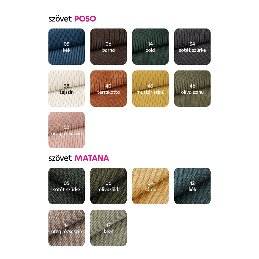 Megrendelhető a Poso szövet 9 színváltozatában és a Matana szövet 6 színváltozatában, fekete vagy bükkfa választási lehetőséggel ár: 80 500 Ft. Egyedi megrendelés esetén a megadott összeg 20%-át előlegként szükséges befizetni. Az előleg befizetése után kérése a gyártásba kerül. Szállítási idő 6-8 hét.