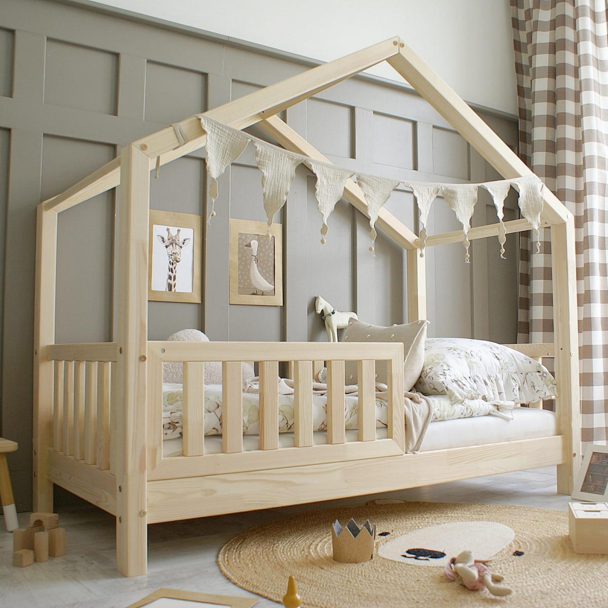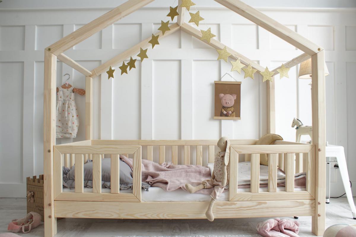 HÁZIKÓ ÁGY LEESÉSGÁTLÓVAL egy skandináv stílusú gyerekágy, amely tökéletes választás modern és letisztult gyerekszobákba.