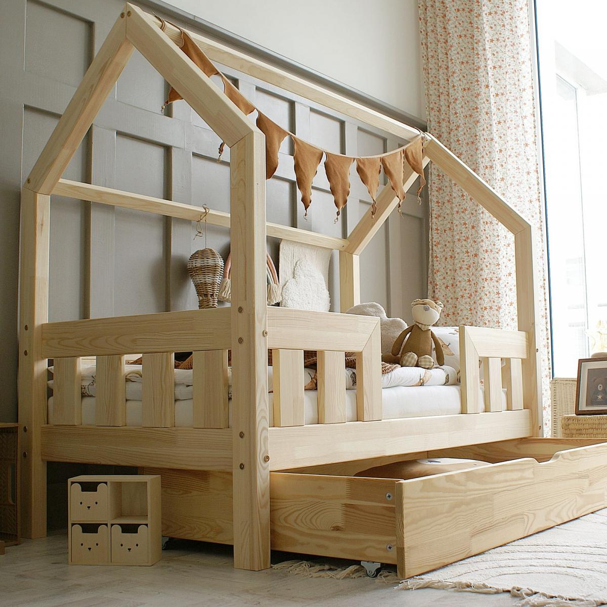 A MAXI PLUS házikó ágy egy masszív, stabil gyerekágy, amely skandináv stílusú mini tetős házikóval rendelkezik. Az ágy biztonságos, leesésgátlós, és kihúzható ágyneműtartó fiókkal is rendelhető, amely igény szerint ágyazható, pótágyként is használható.
