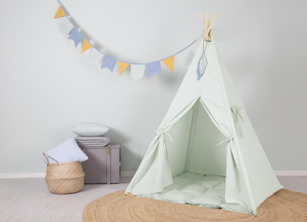 A sátor alaptartozéka a játszószőnyeg, a girland zászló és a toll dísz.