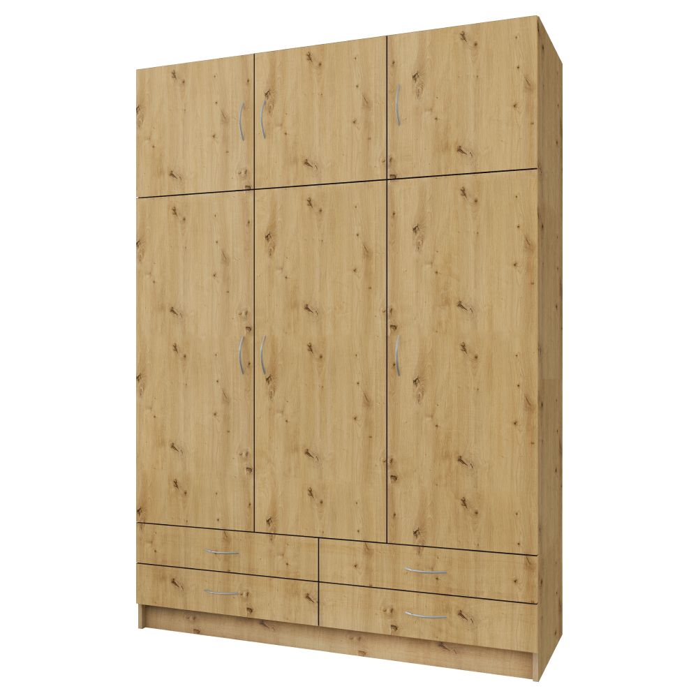 Anyag: laminált DTD Szín: artisan tölgy Méretek (SzxMéxMa): 135,1x54,6x194 cm Fiók méretei (SzxMa): 67,1x14,6 cm Háromajtós Négy fiók Fiók teherbírása: 3 kg Bővítményekkel Polcos Polc teherbírása: 5 kg Akasztós Akasztórúd teherbírása: 10 kg Fém fogantyúk Szétszerelve szállítva