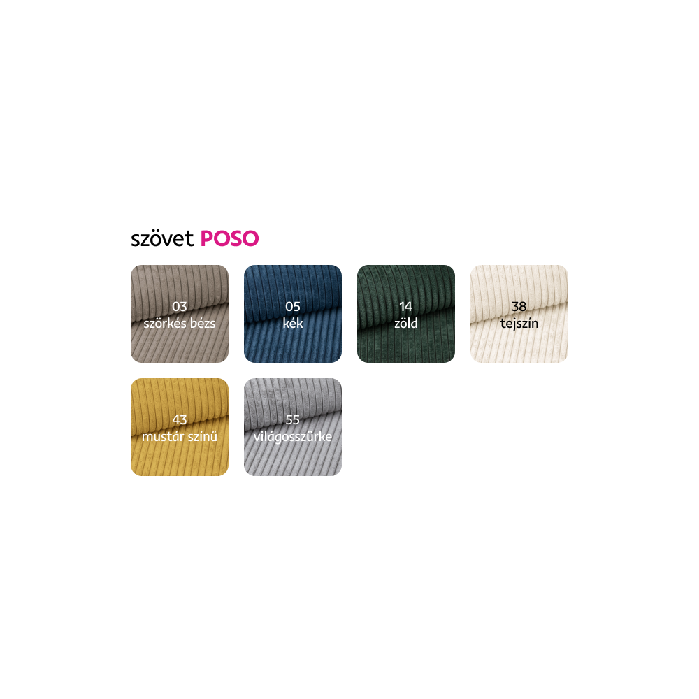 Megvásárolható a Poso szövet 6 színváltozatában ár: 467 900 Ft. Egyedi megrendelés esetén az összeg 20%-át előlegként kell kifizetni. Az előleg befizetése után kérése a gyártásba kerül. Szállítási idő 6-8 hét.