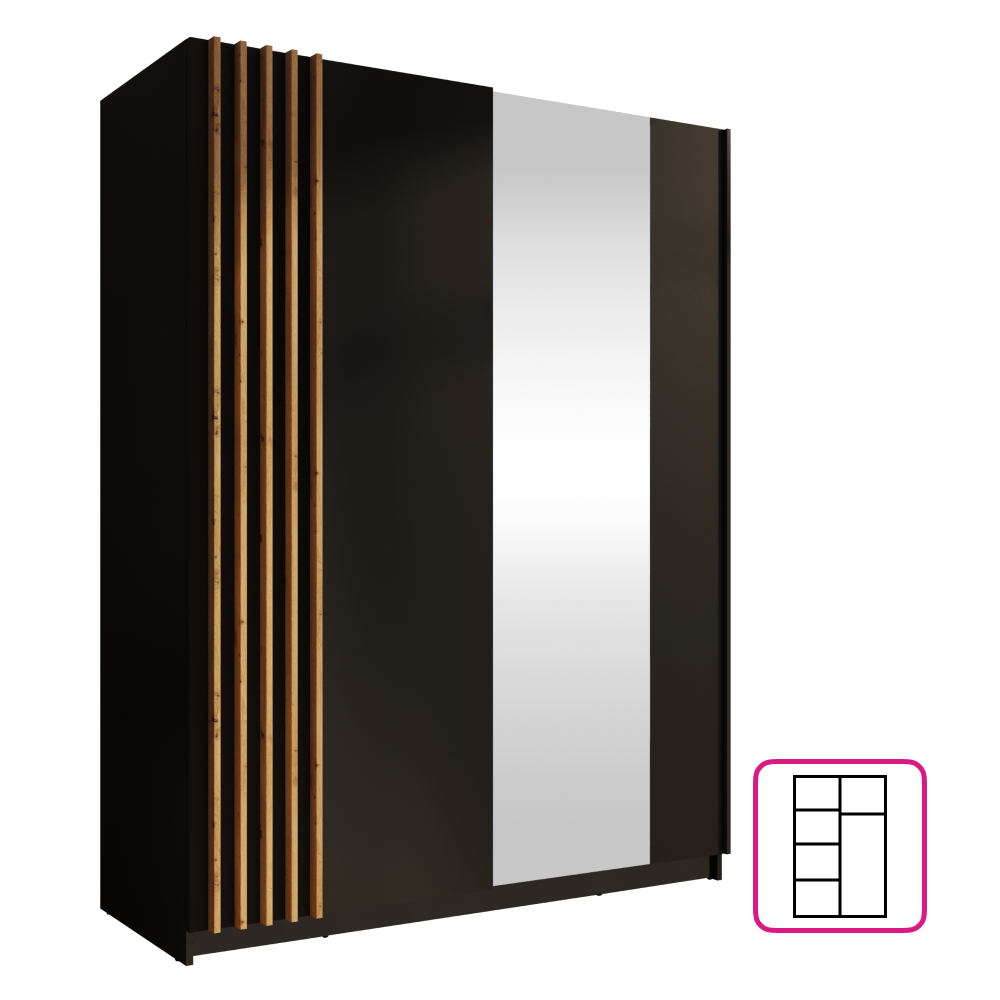 Anyag: laminált DTD/MDF/üveg Szín: fekete/artisan tölgy Méretek (SzxMéxMa): 150x63,5x198,5 cm Anyag vastagsága: 1,6 cm Üveg vastagsága: 0,3 cm Dekoratív lécek Tükörrel Kétajtós Tolóajtókkal Akasztórúd Polcos rész Polcok teherbírása: 5 kg Javasoljuk, hogy rögzítse a falhoz Modern dizájn Szétszerelve szállítva