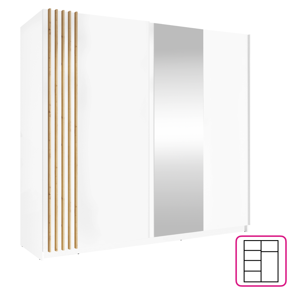 Anyag: laminált DTD/MDF/üveg Szín: fehér/artisan tölgy Méretek (SzxMéxMa): 200x63,5x198,5 cm Anyag vastagsága: 1,6 cm Üveg vastagsága: 0,3 cm Dekoratív lécek Tükörrel Kétajtós Tolóajtókkal Akasztórúd Polcos rész Polcok teherbírása: 5 kg Javasoljuk, hogy rögzítse a falhoz Modern dizájn Szétszerelve szállítva