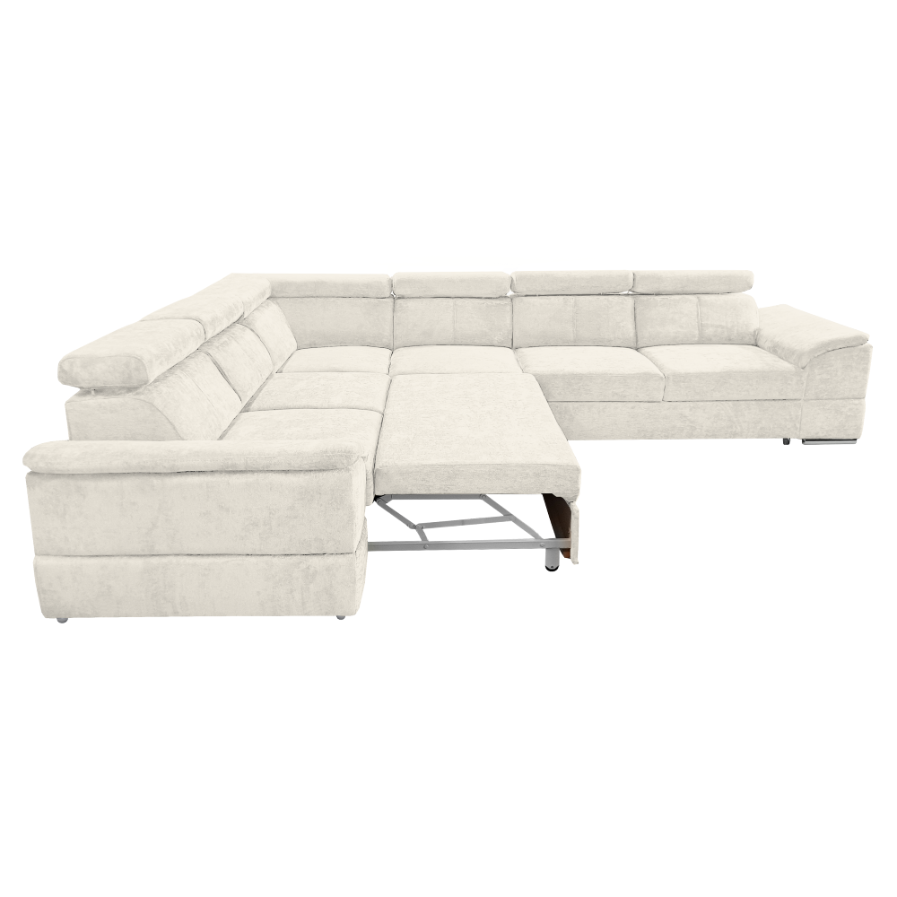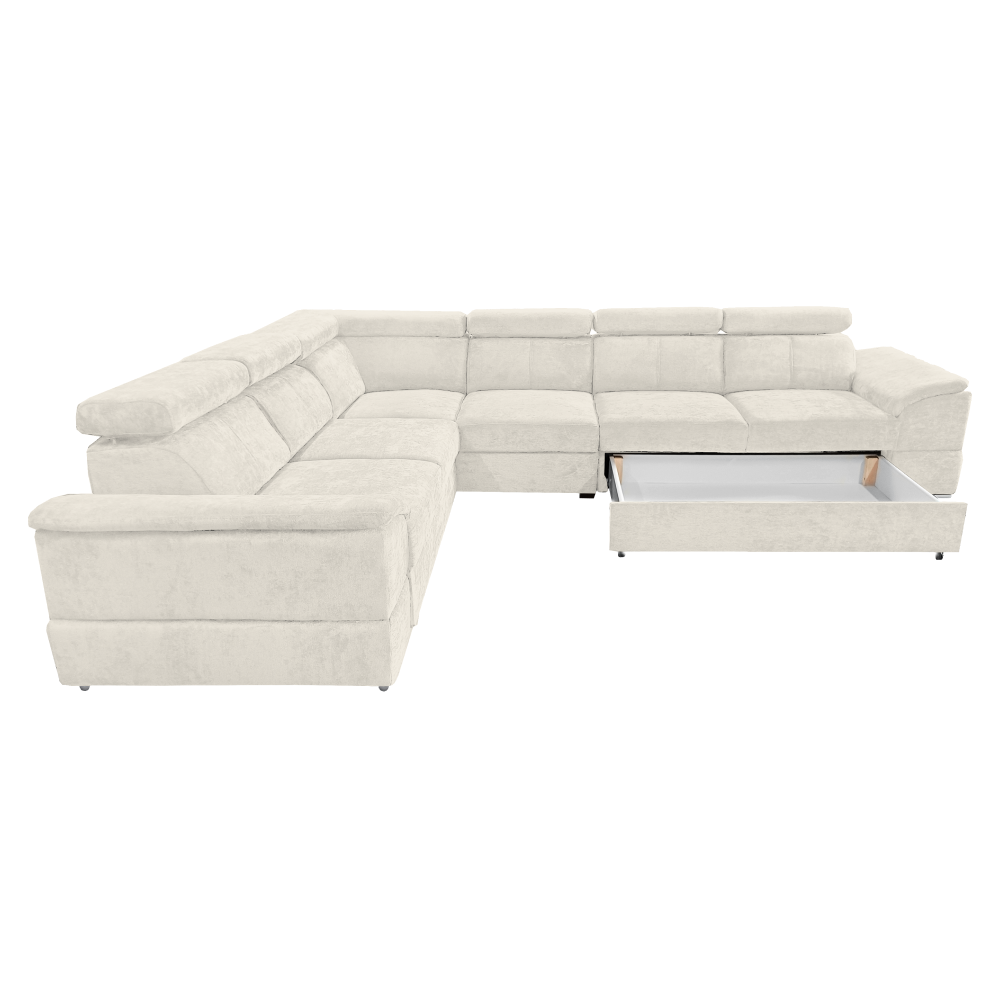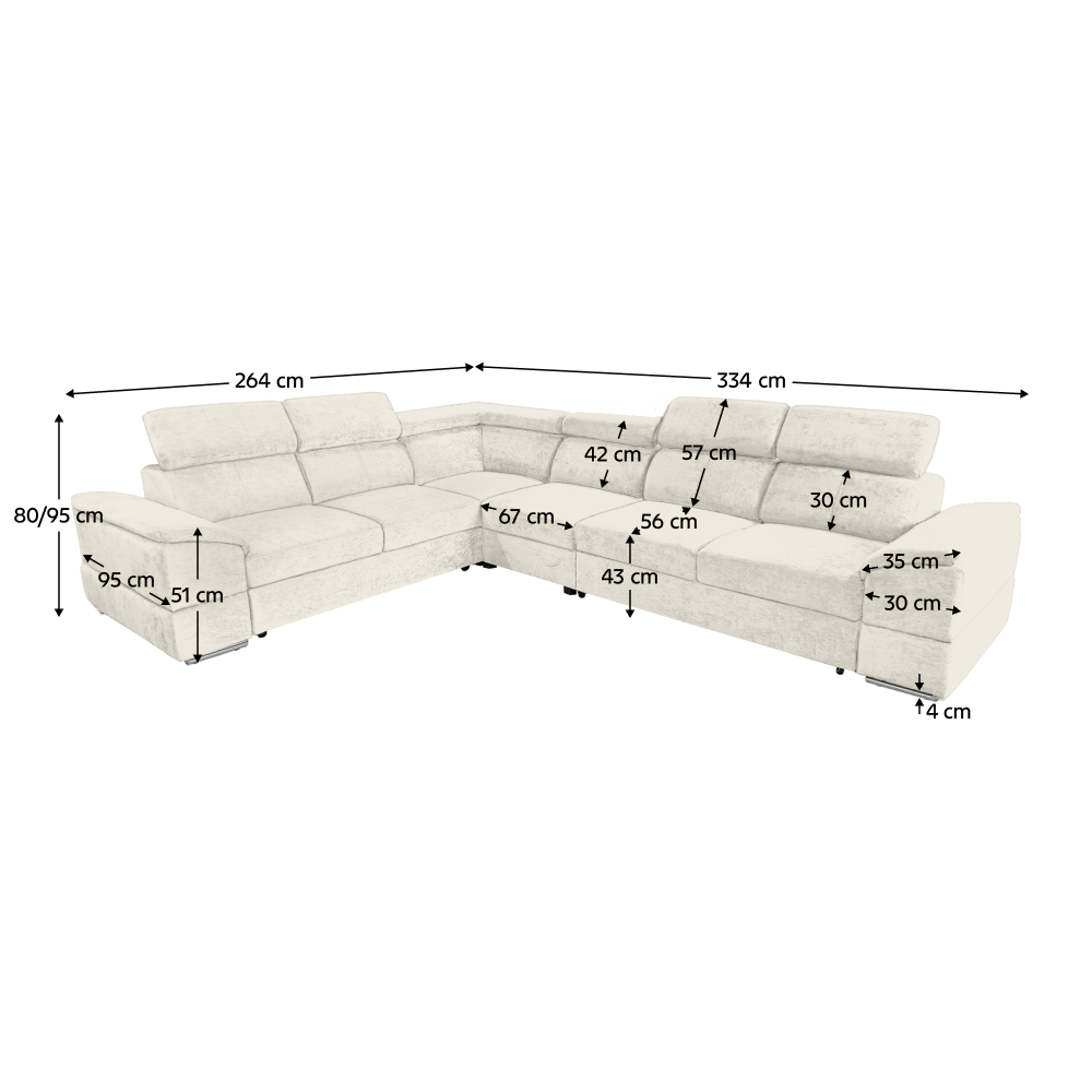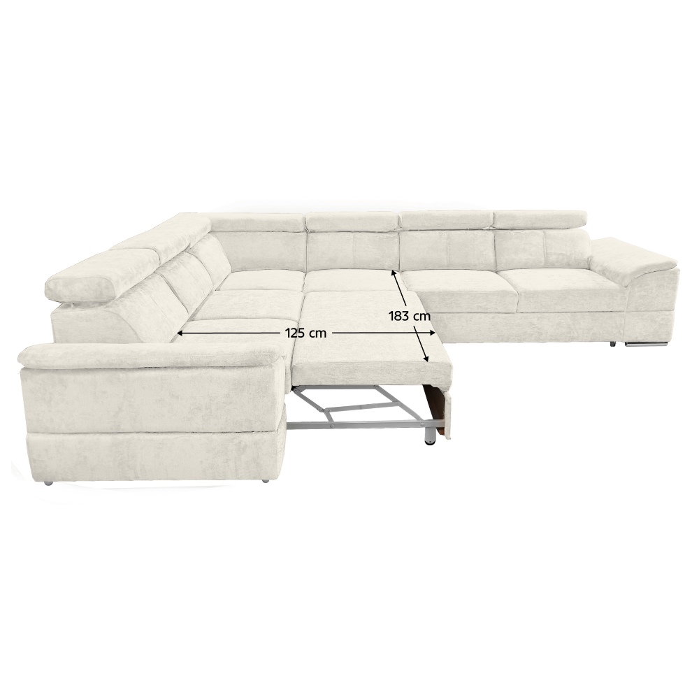 nyag: szövet Sereno 681 A szövet kopásállósága: 80 000 Martindale Szín: krémszínű Méretek (SzéxMéxMa): 334x264x80 cm Az ülőgarnitúra magassága felemelt támasztékokkal: 95 cm Kinyitható Fekvőterület (SzéxH): 183x125 cm Ülőrész magassága: 43 cm Ülőrész mélysége: 56 cm A kartámasz méretei SzéxMa: 35x51 cm A háttámla magassága: 30 cm Fejtámla magassága: 27 cm Lábak magassága: 4 cm Kárpitozott Univerzális Rakodótérrel 5 állítható fejtámla 6 fokozatban állítható támasztékok Az ülőrész rugós kitöltéssel Szállítás szétszerelve Megvásárolható a Sereno szövet 9 színváltozatában ár: 586 500 Ft és a Majestic szövet 11 színében ár: 620 900 Ft. Egyedi megrendelés esetén az összeg 20%-át előlegként kell kifizetni. Az előleg befizetése után kérése a gyártásba kerül. Szállítási idő 6-8 hét.