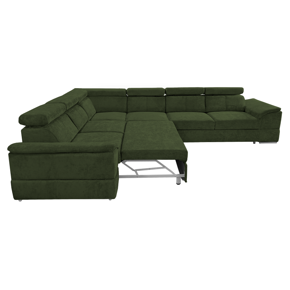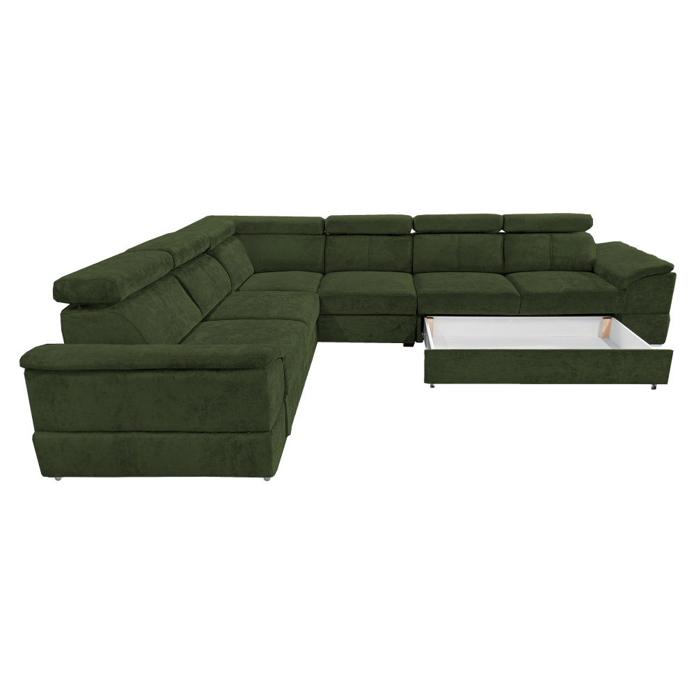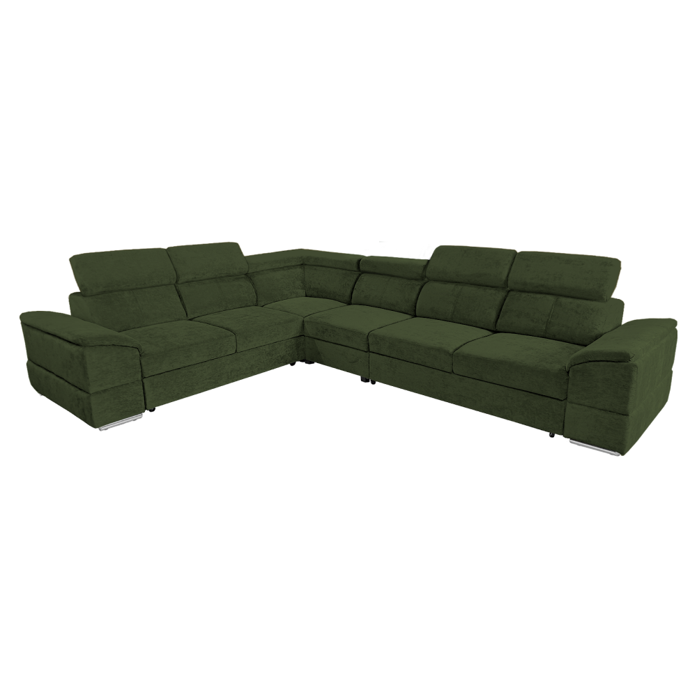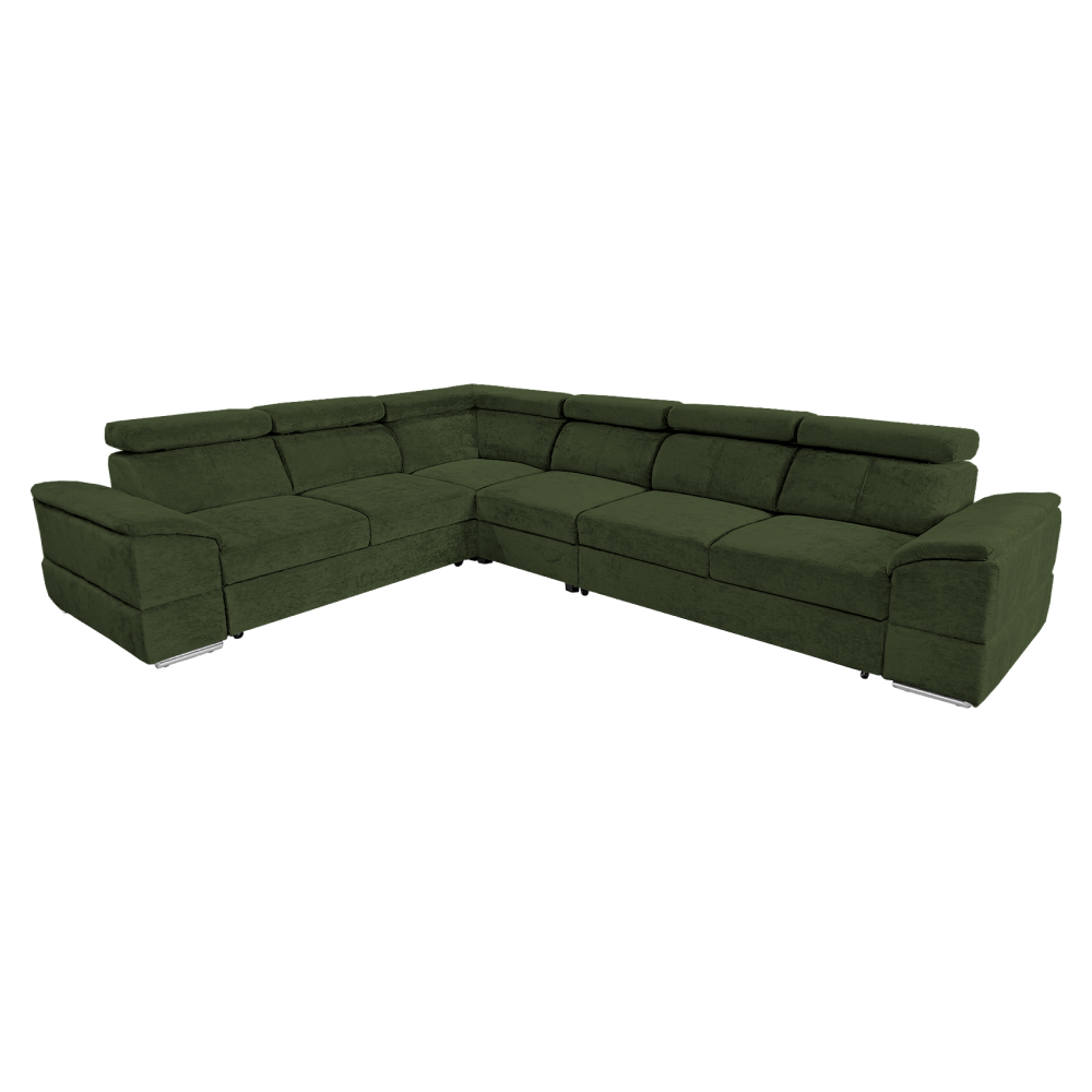 nyag: szövet Sereno 690 A szövet kopásállósága: 80 000 Martindale Szín: sötétzöld Méretek (SzéxMéxMa): 334x264x80 cm Az ülőgarnitúra magassága felemelt támasztékokkal: 95 cm Kinyitható Fekvőterület (SzéxH): 183x125 cm Ülőrész magassága: 43 cm Ülőrész mélysége: 56 cm A kartámasz méretei SzéxMa: 35x51 cm A háttámla magassága: 30 cm Fejtámla magassága: 27 cm Lábak magassága: 4 cm Kárpitozott Univerzális Rakodótérrel 5 állítható fejtámla 6 fokozatban állítható támasztékok Az ülőrész rugós kitöltéssel Szállítás szétszerelve Megvásárolható a Sereno szövet 9 színváltozatában ár: 586 500 Ft és a Majestic szövet 11 színében ár: 620 900 Ft. Egyedi megrendelés esetén az összeg 20%-át előlegként kell kifizetni. Az előleg befizetése után kérése a gyártásba kerül. Szállítási idő 6-8 hét.