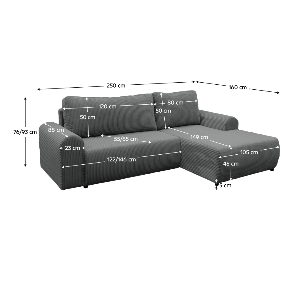 Méretek (SzxMéxMa): 250x160x76/93 cm